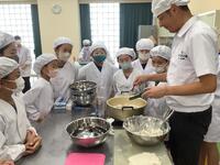 家庭科室に移動し、竹棒にすり身をつける実習をしました。ぬらした手の上にすり身をもらって、竹棒に均等につけました。その後、竹輪焼き機で焼いてもらいました。焼きたての竹輪を食べて、「めっちゃ、おいしい!」「ふんわりして、おいしい!」最高に美味しいちくわをいただきました!